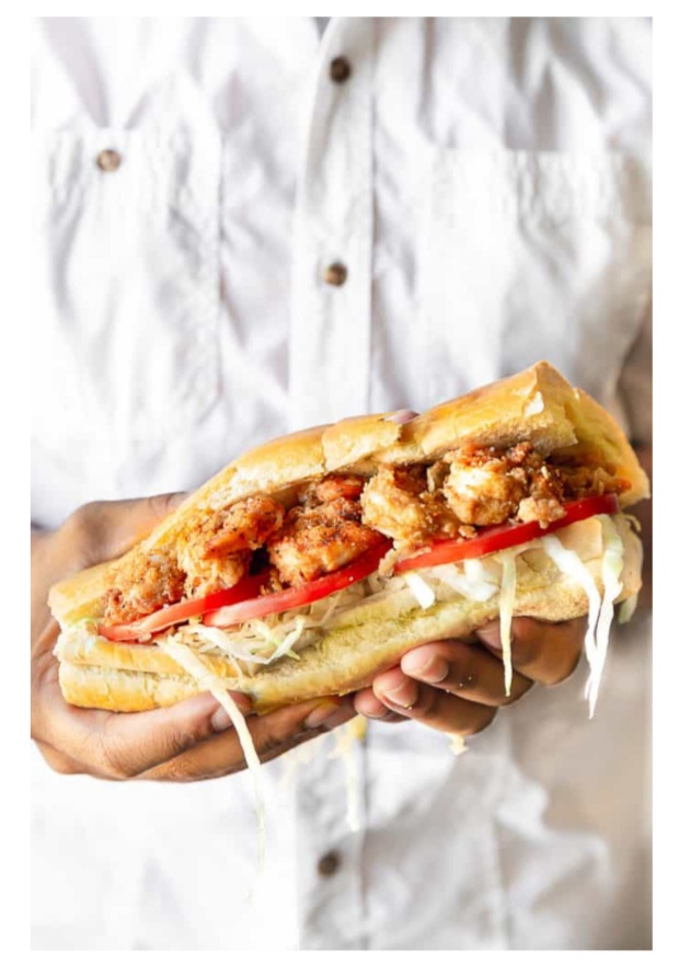 They say, “This Authentic New Orleans Shrimp Po’ Boy with Creole Remoulade Sauce pictured below will knock your socks off! Crispy cajun fried shrimp are piled on a french baguette and topped with a creole inspired creamy remoulade sauce creating the most delicious and authentic po’boy you will ever taste outside of NOLA! Served with her New Orleans Beignets , Seafood Gumbo or Shrimp Etouffee for a truly creole inspired meal!”