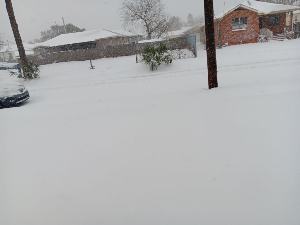 GAZETTE (New Orleans) — I took this below picture at 2:45pm on Jan. 21. The snow was still falling, and it was almost higher than the bottom of my front door. I was a tad bit worried because it was seeping underneath my door and causing a puddle of water inside. The news said that the snow was higher in New Orleans that day than the 1885 blizzard here.