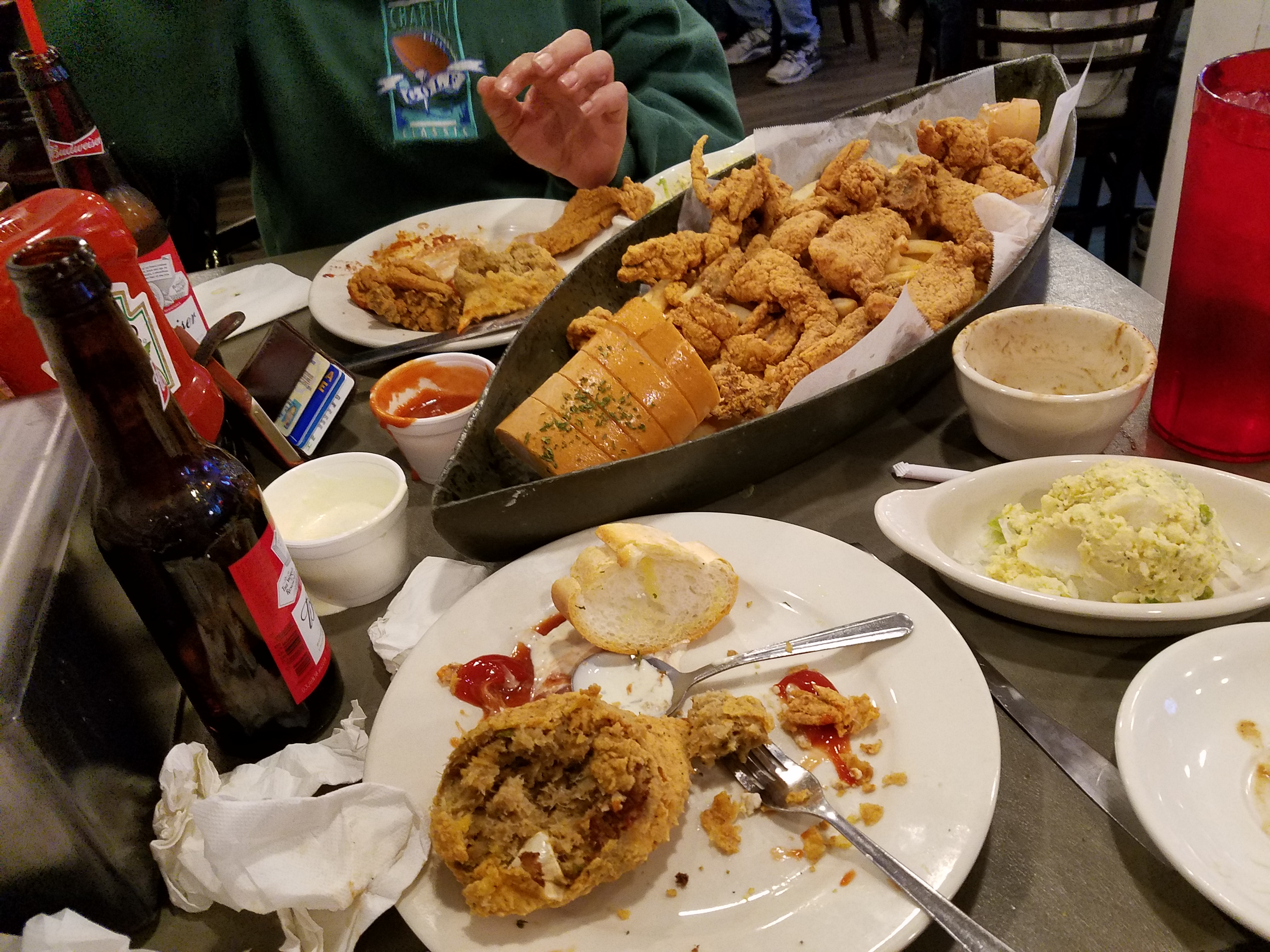 After our meal, I brought home two “go plates” (my share) from the boat. Guess what! When I got home, I finished off all of the leftover seafood, leaving only the french fries for today.